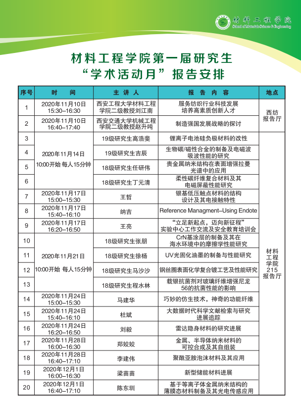 根据英国365公司《关于开展2020年研究生学术活动月的通知》(研字 2020 年 6 号)文件精神,为进一步营造浓厚的科学研究氛围,加强研究生创新能力培养,培养创新意识,展现研究生的学术风采,搭建师生交流平台。英国365集团于2020年11月2日至2020年12月2日举办了2020年“研究生学术活动月”活动。活动以“彰显材子风采,活跃学术氛围”为主题,活动内容由启动仪式暨首场报告会、“材子论坛”—特邀专家报告、“材子论坛”—研究生学术报告、各学科方向沙龙等四部分组成,内容丰富、形式多样,取得了良好的成效。